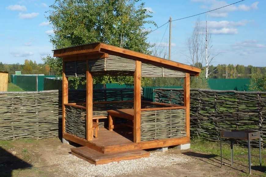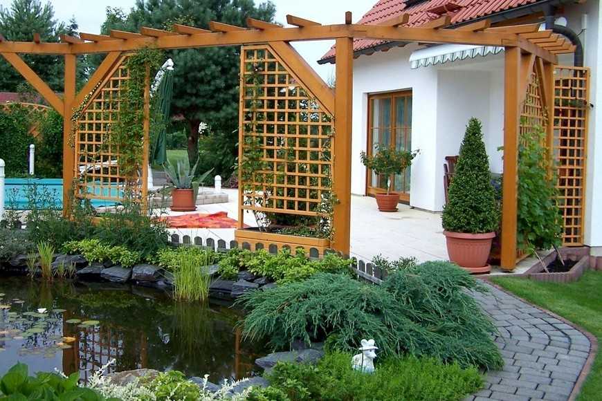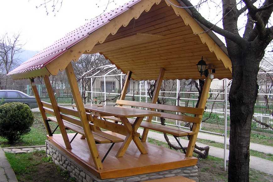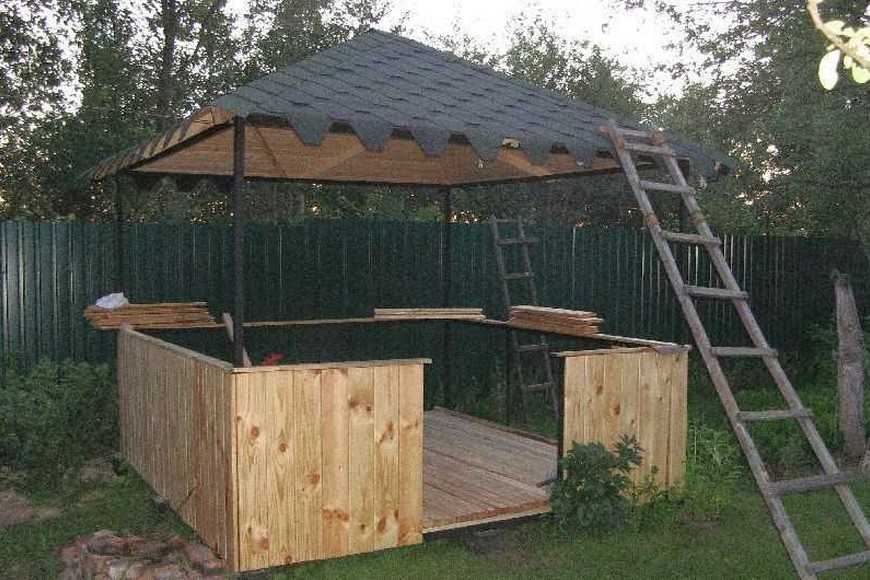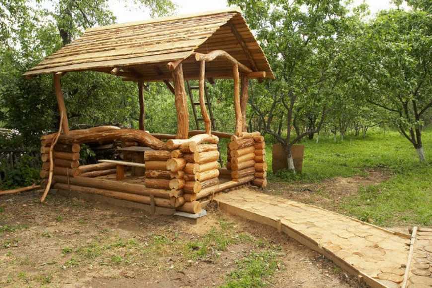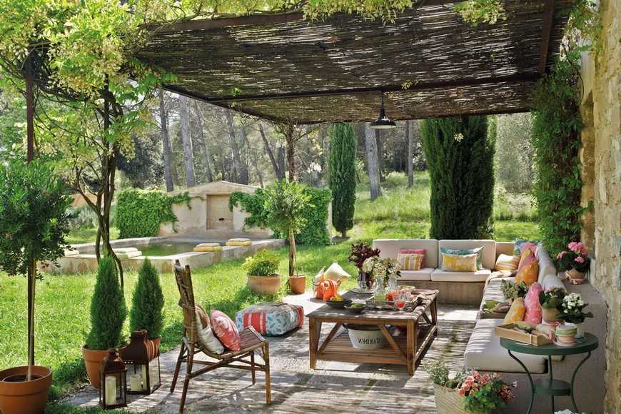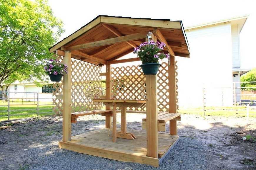 Просторную беседку или патио можно сделать своими руками. Она может иметь надёжную крышу или обычный навес, быть крошечной или напоминать комфортно обустроенный внутренний дворик. Стены беседки украшают вьющимися растениями, декором из кирпича, цемента.