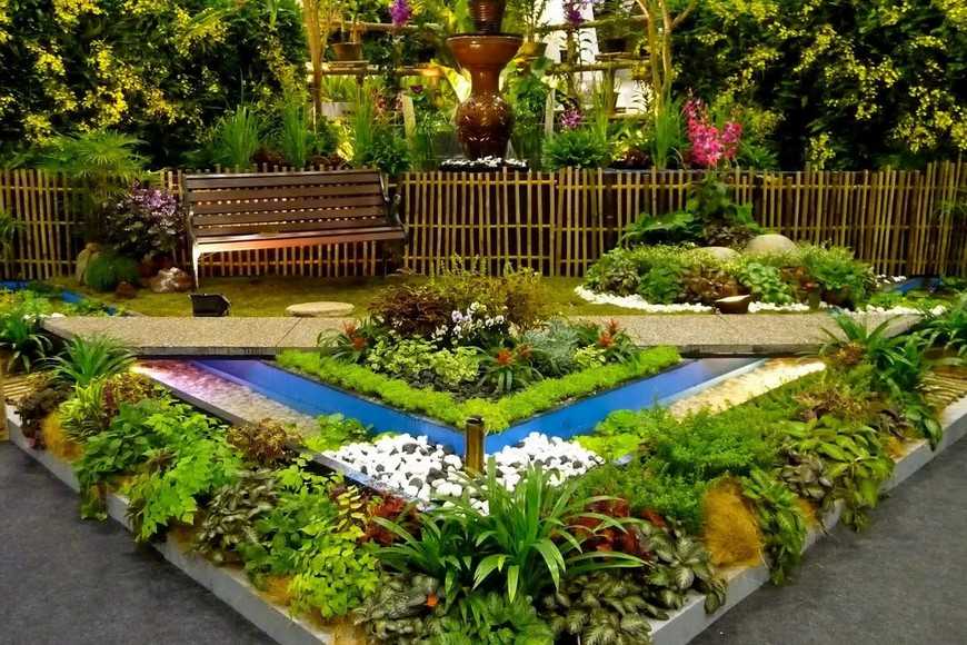 Здесь клумбы складываются в причудливые орнаменты, используется легкий декор, цветной песок и гравий.