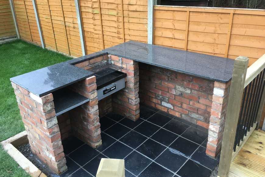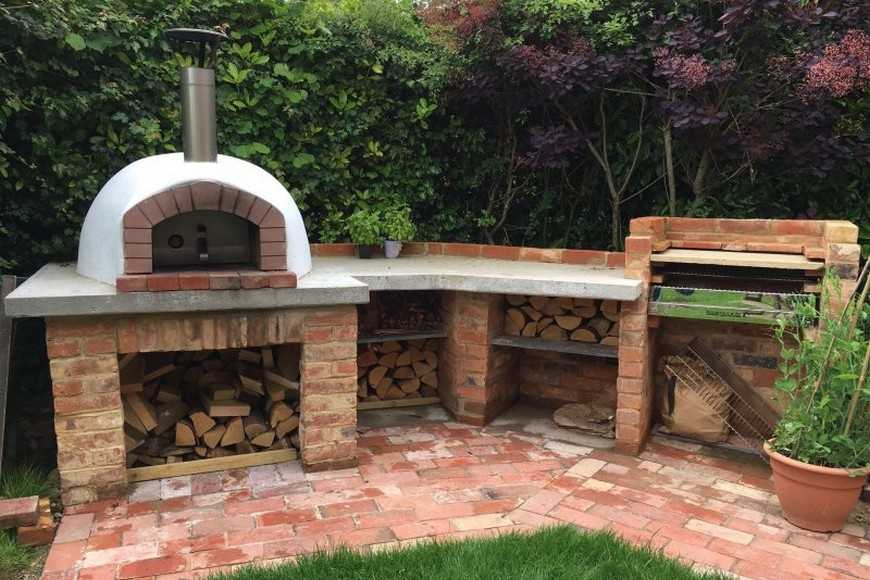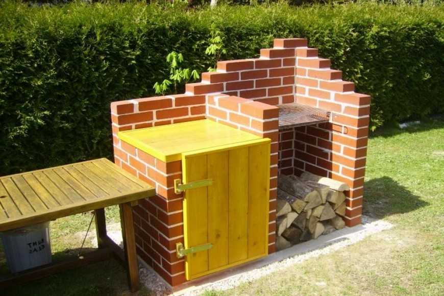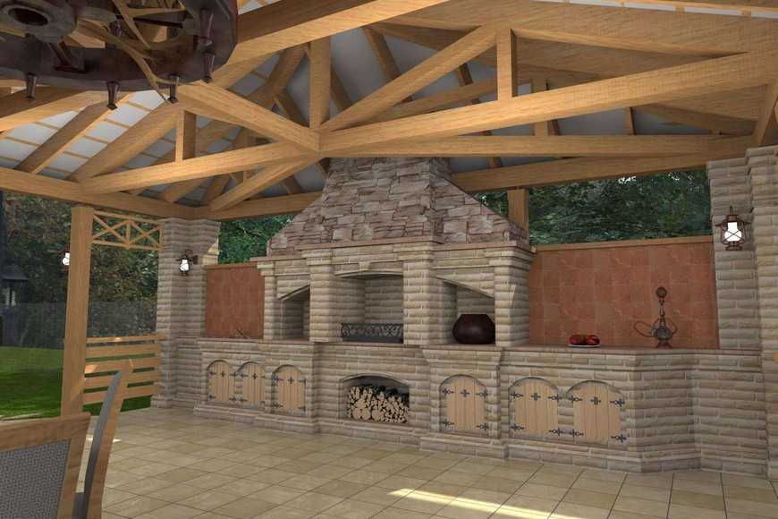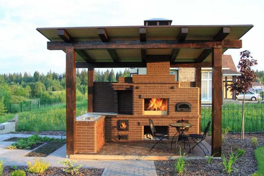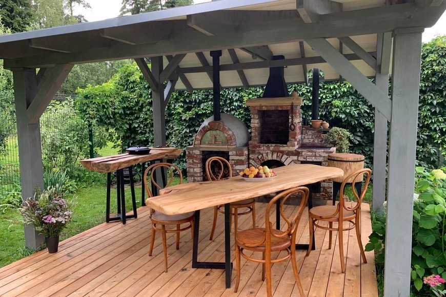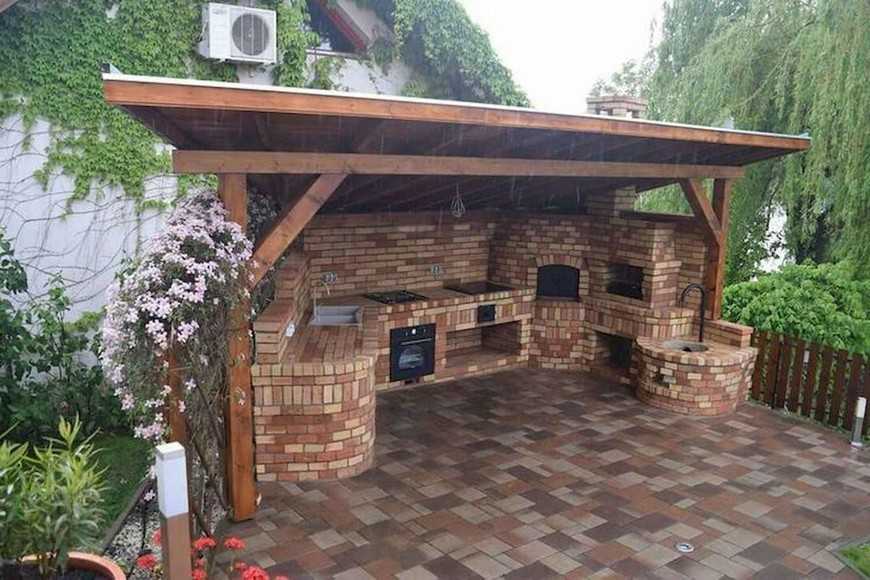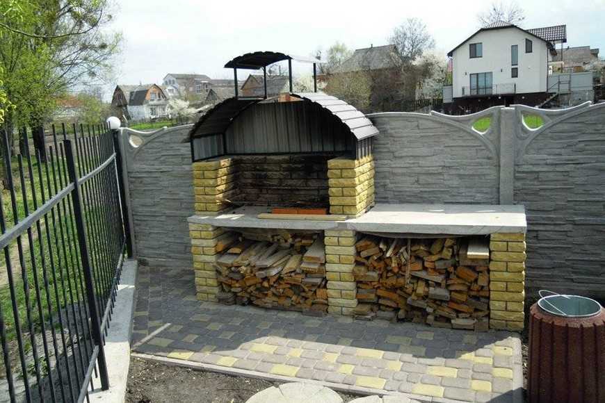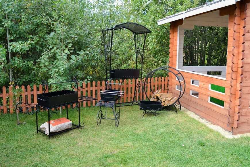 Для стационарного барбекю в саду предусматривают навес. Площадку заливают из бетонного раствора, по возможности организуют доступ к источнику воды. Рядом с мангалом устанавливают столик, продумывают расположение полочек, ящиков.
