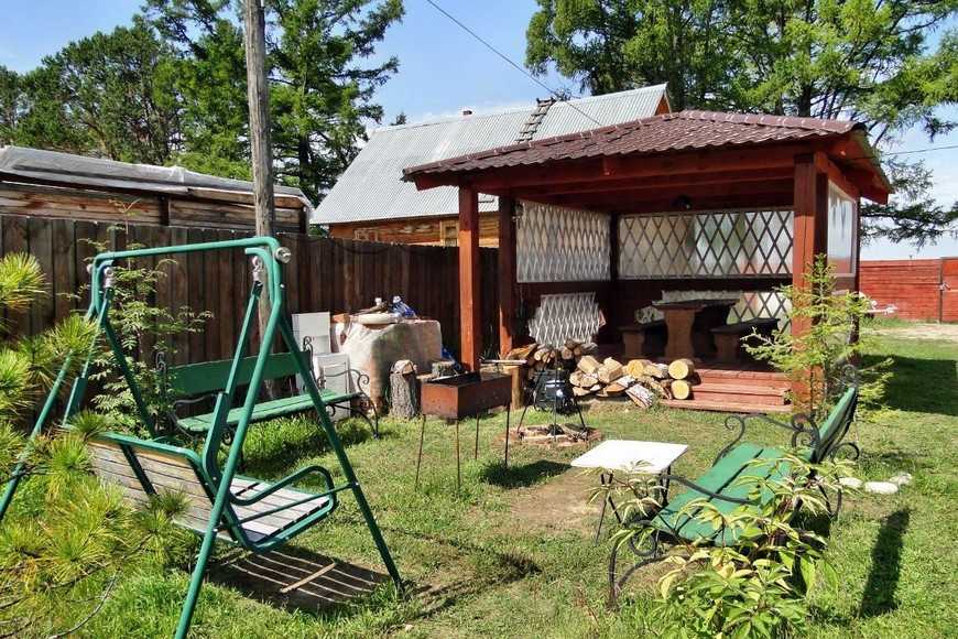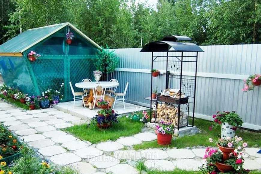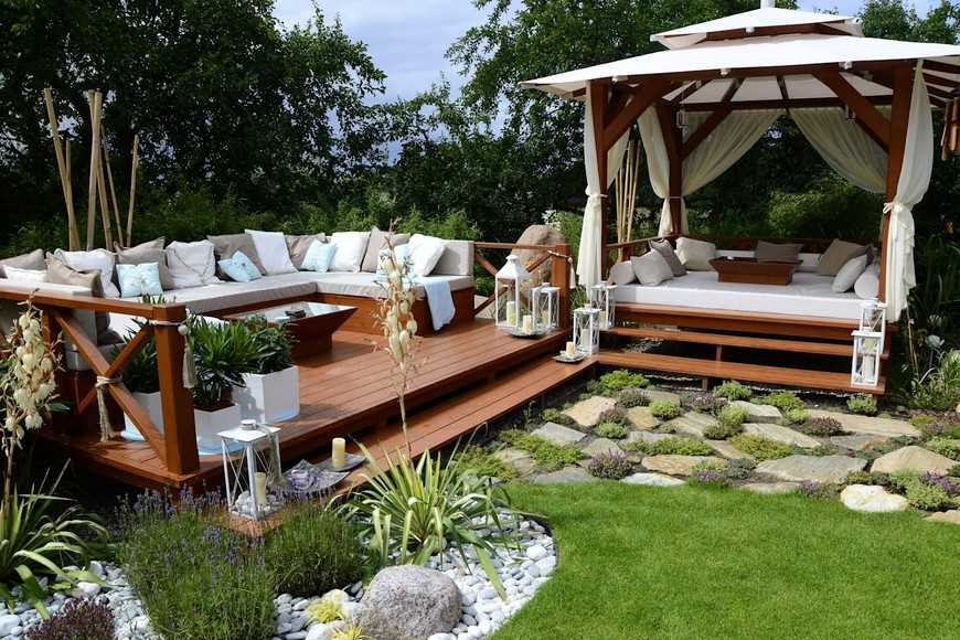 На даче не обойтись без места для отдыха, где можно принять солнечную ванну или расслабиться после работы. Обычно его располагают неподалёку от дома, соединяя со зданием дорожкой.