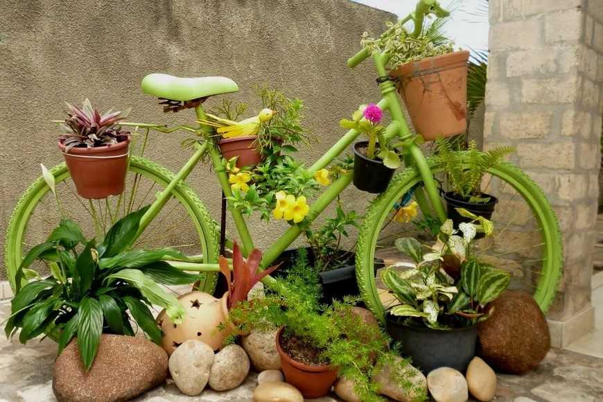 Выкрашенный в яркие оттенки велосипед закрепляют у забора, дерева в саду или рядом с хозяйственной постройкой, присверливают к нему металлическую тару. Засыпают землю и высаживают растения.
