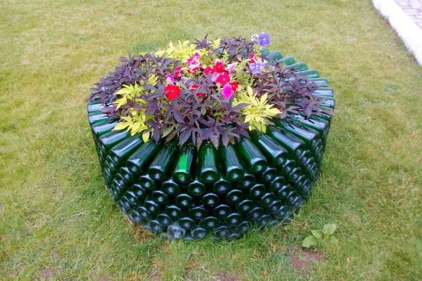 - Собери оригинальный заборчик из цветных стеклянных бутылок: просто погрузи их горлышком в почву. А можешь выкладывать из них сложные радиальные конструкции, но тогда не забывай об укреплении сторон.