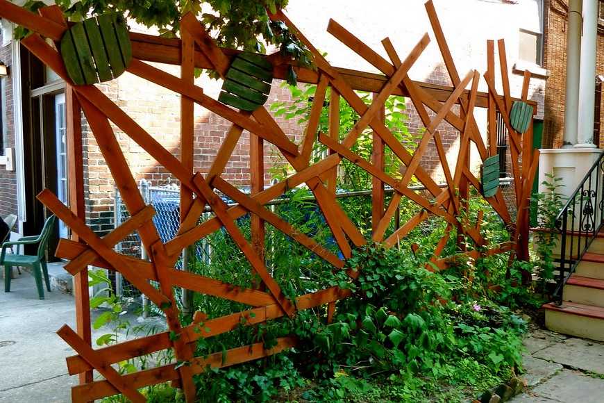 - Сделай небольшую плетеную ограду из сухих веток. Даже обычные вертикальные палочки можно установить в интересные художественные композиции. Используй деревянные колышки и обычные доски. Нарежь лист фанеры или заднюю стенку ненужного шкафа.