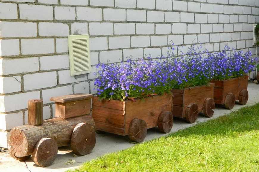- телега, выступающая в качестве основы для клумбы в деревенском стиле;
