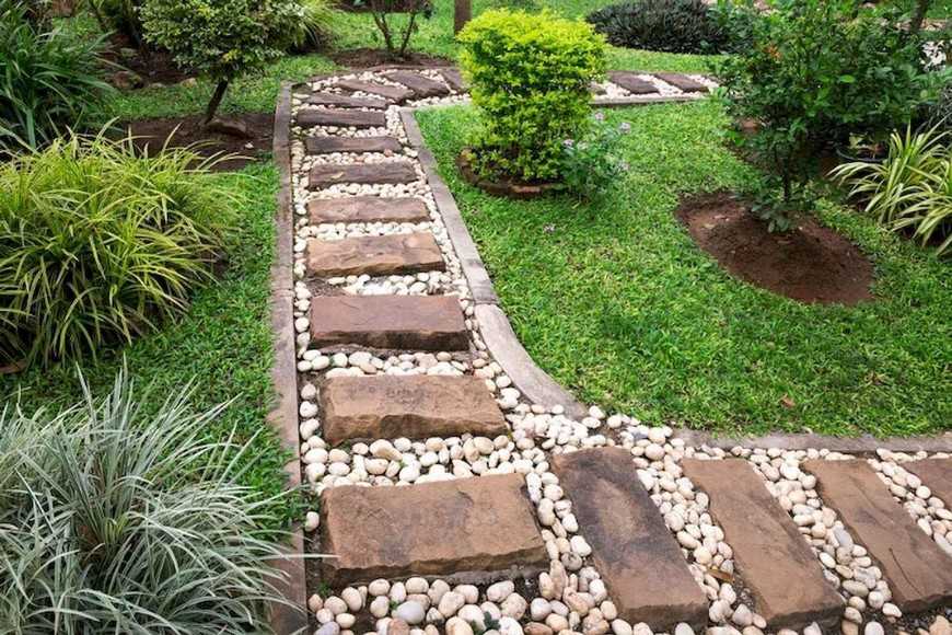 Дешёвые и стильные дорожки получаются из гальки и гравия. Эти материалы обладают прекрасными дренажными свойствами, на них не будет скапливаться вода. Чтобы камешки со временем не смещались, лучше сразу установить по границам бордюры.
