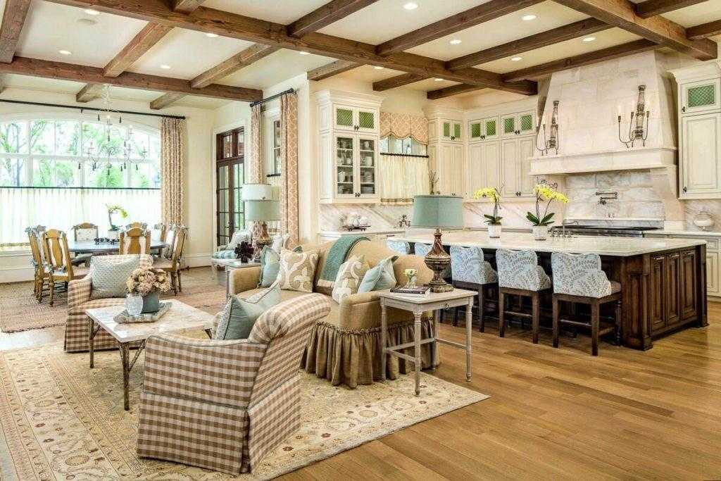 Уютный стиль, при помощи которого можно оформить кухню-столовую. Основной акцент делается на уют. Гостиная должна отделяться от зоны, которая отведена для приема пищи. В отличие от классического стиля, здесь важную роль играет очаг, а не обеденный стол. Не терпит прованс наличие мягких диванов, их потребуется заменить на кушетки с деревенскими мотивами. Для организации комфортной гостиной зоны ее следует отгородить от столовой и кухни, возможно, при помощи визуальных средств. Подобный стиль будет хорошо смотреться в деревянном доме, так как он предполагает использование мебели из массива, без пластиковых, глянцевых поверхностей.