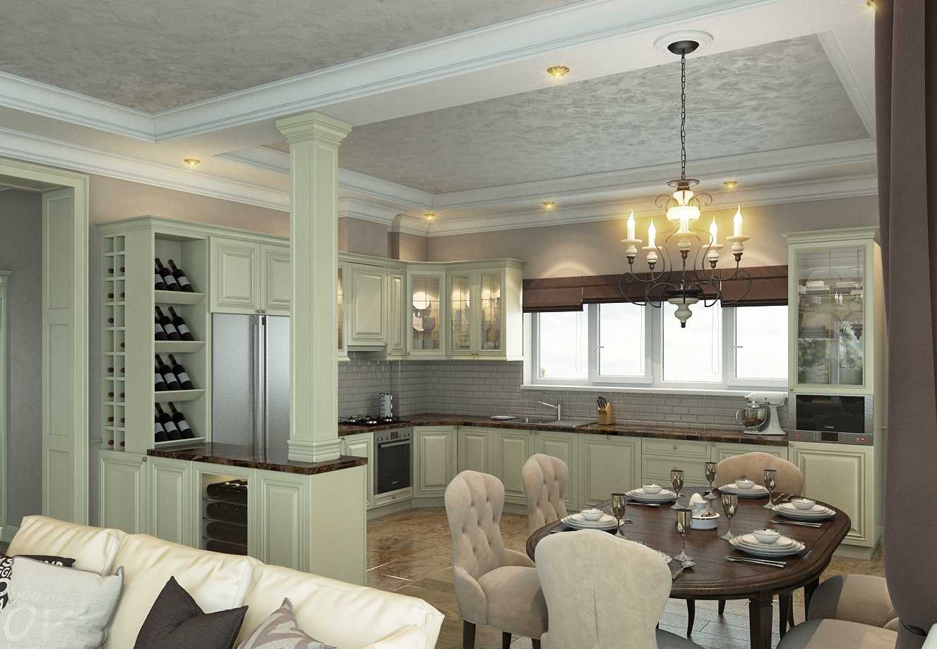 В интерьере кухни-гостиной в классическом стиле уместно преобладание дорогих материалов в виде камня, дерева, изысканной керамики и гипсовой лепнины. Помещение предполагает наличие больших окон и высоких потолков.