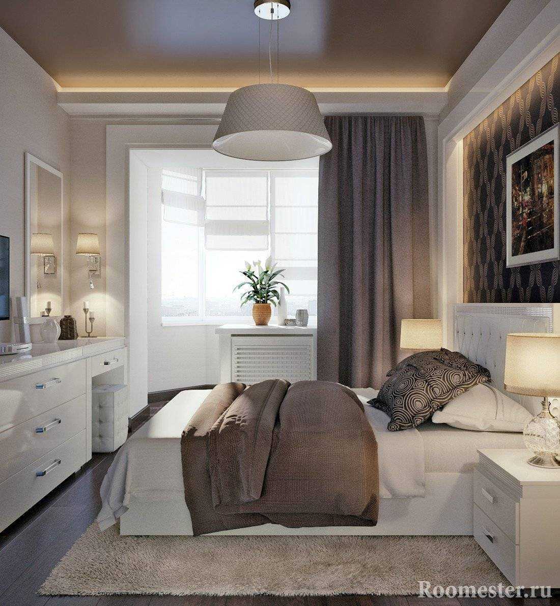 Обрати внимание на то, что с помощью цветов и рисунков можно корректировать геометрию комнаты. Если на фоне светлой отделки одну стену сделать темной, она визуально приблизится – это хороший прием для маленькой узкой спальни