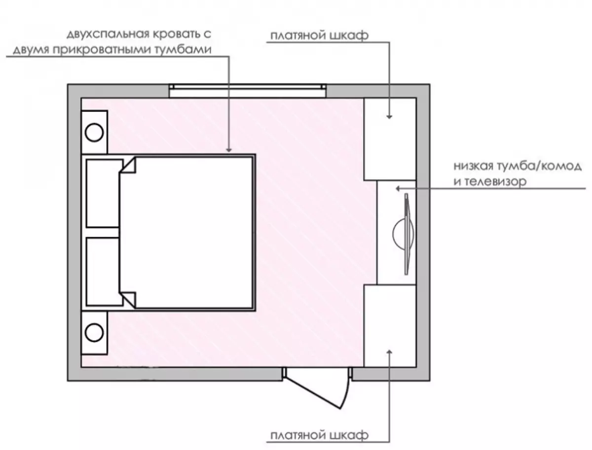 При расстановке мебели в спальне 9 кв.м. отталкивайтесь от архитектуры комнаты. Если она имеет прямоугольную форму, то желательно приблизить ее к более квадратной. Кроме визуальных способов, которые мы обсуждали в теме отделки, это можно сделать и с помощью мебели.