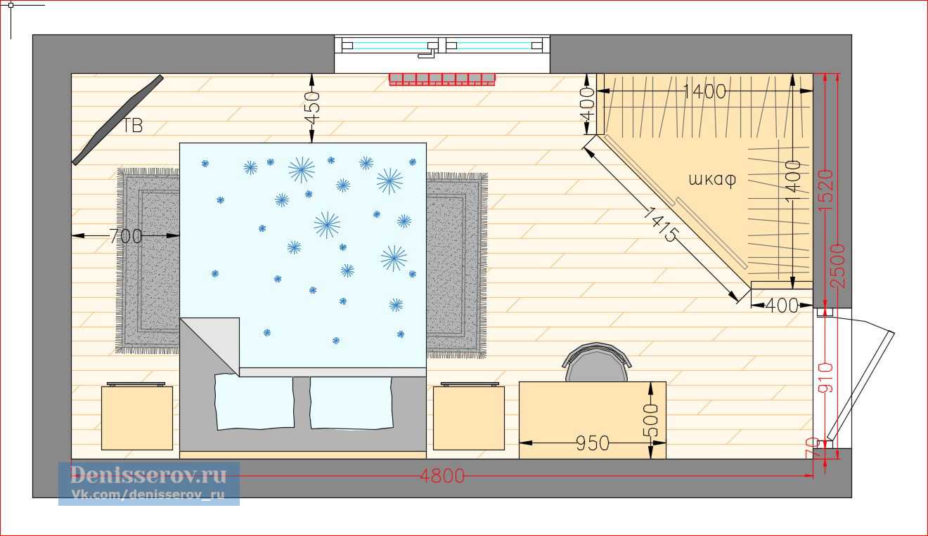 При ее установке поперек останется достаточно свободного места для другой мебели. Однако следует оставить необходимый проход с двух сторон для двуспальной кровати