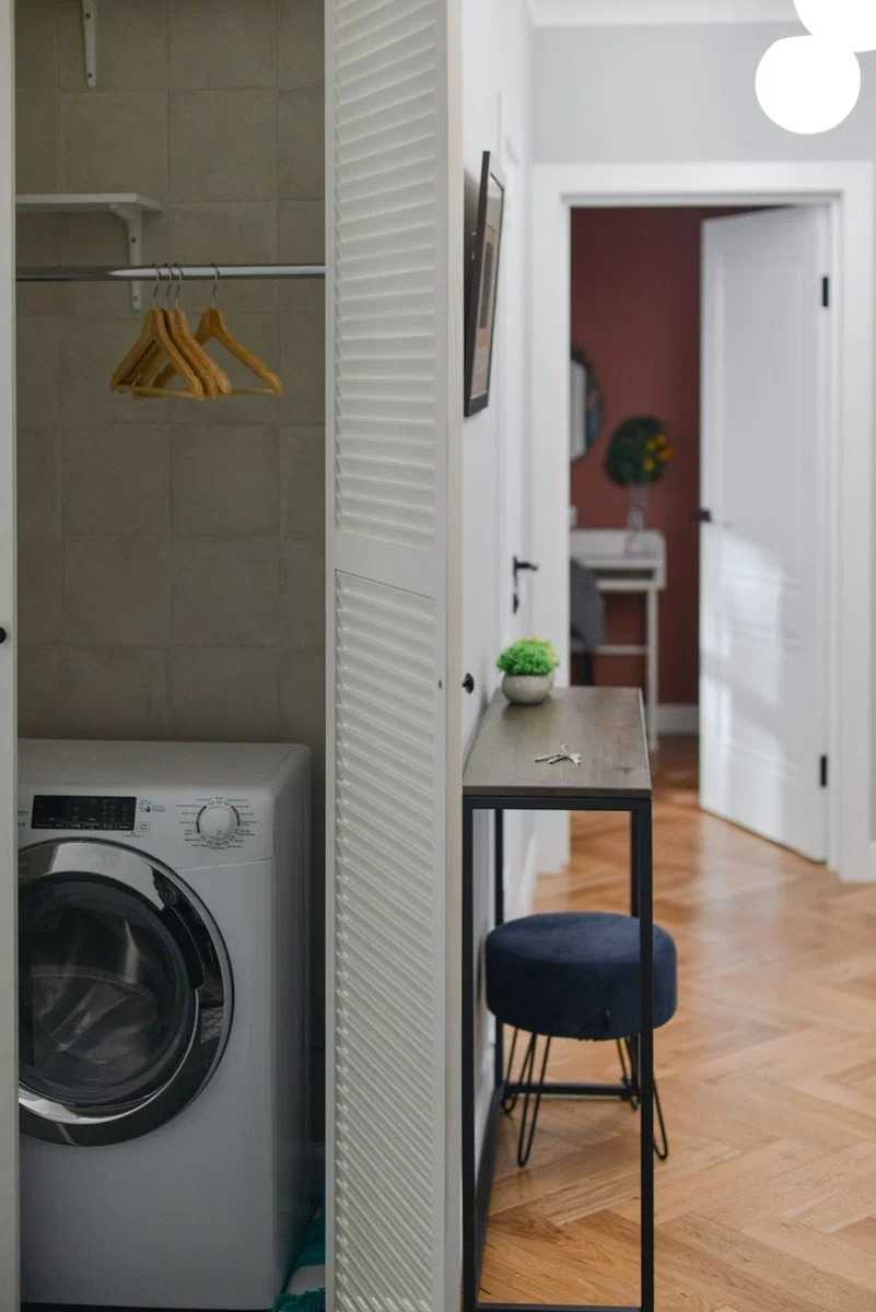 В шкафу стоит предусмотреть дополнительные места для хранения бытовой химии, бельевой корзины и других хозяйственных принадлежностей. Это решение освободит кухню и санузлы от лишних шкафов и дополнительной функциональной нагрузки. Конечно, нельзя просто так встроить в шкаф стиральную машину, нужно изначально предусмотреть вентиляцию, подходящее место для шкафа, дополнительные розетки.