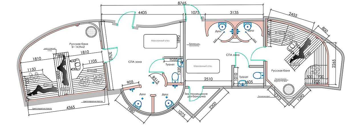 Предложенные в данном проекте функциональные пространства включают в себя: термальную зону, представленную русскими банями, моечный блок, зону спа процедур, зону массажа. В проекте также предусмотрено техническое помещение для банщика.