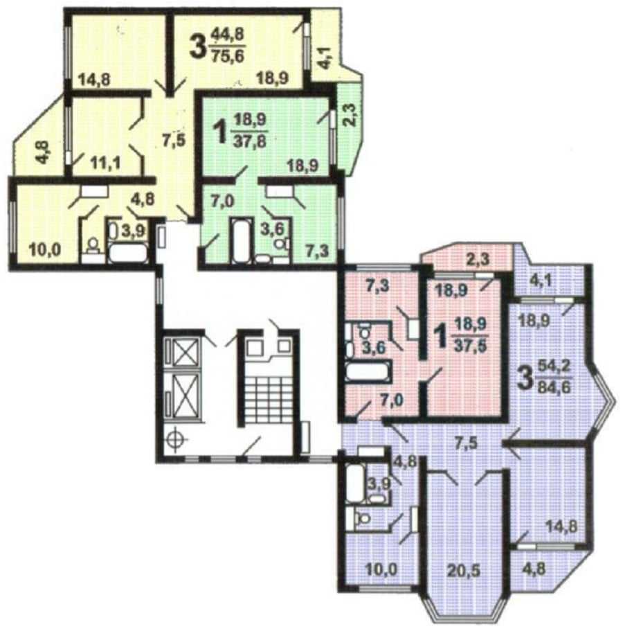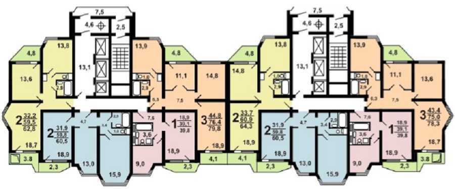 На схеме представлены две «линейных» секции, включающих две двухкомнатные, однокомнатную и трехкомнатную квартиры. Разница в площади между двухкомнатными — 2,3 м2 в левом подъезде и 3,8 в правом, однокомнатная представлена крупной вариацией с общей площадью в 39,8 м2. Трехкомнатная — ближе к среднему сегменту с площадью 78,3 м2 в одной секции и 79,8 м2 — в другой. На этаже размещены два грузовых лифта, один пассажирский, выход на лестничный пролет отсекается двумя дверями, разделяющими отделение с мусоропроводом.