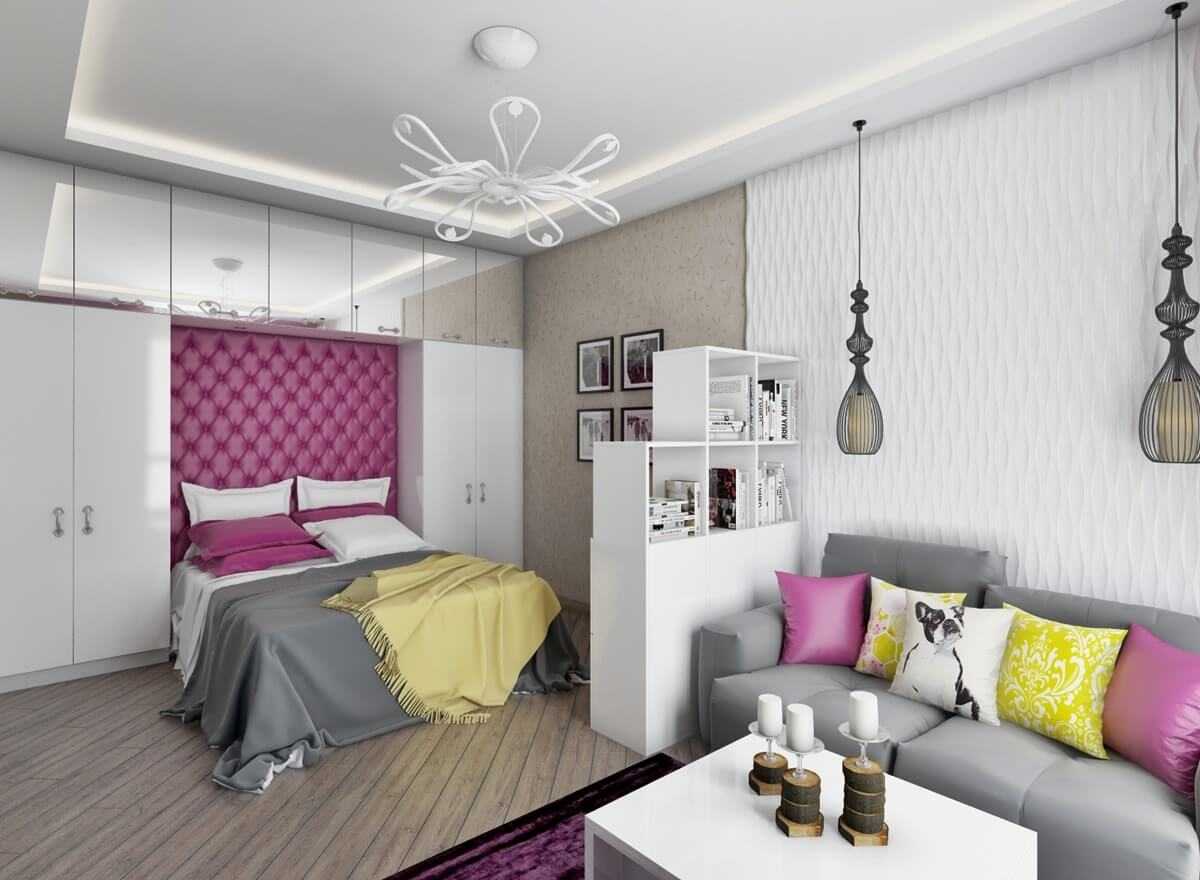 Отличный вариант для гостиной со спальней и большим количеством места для хранения вещей вы видите на фото выше.