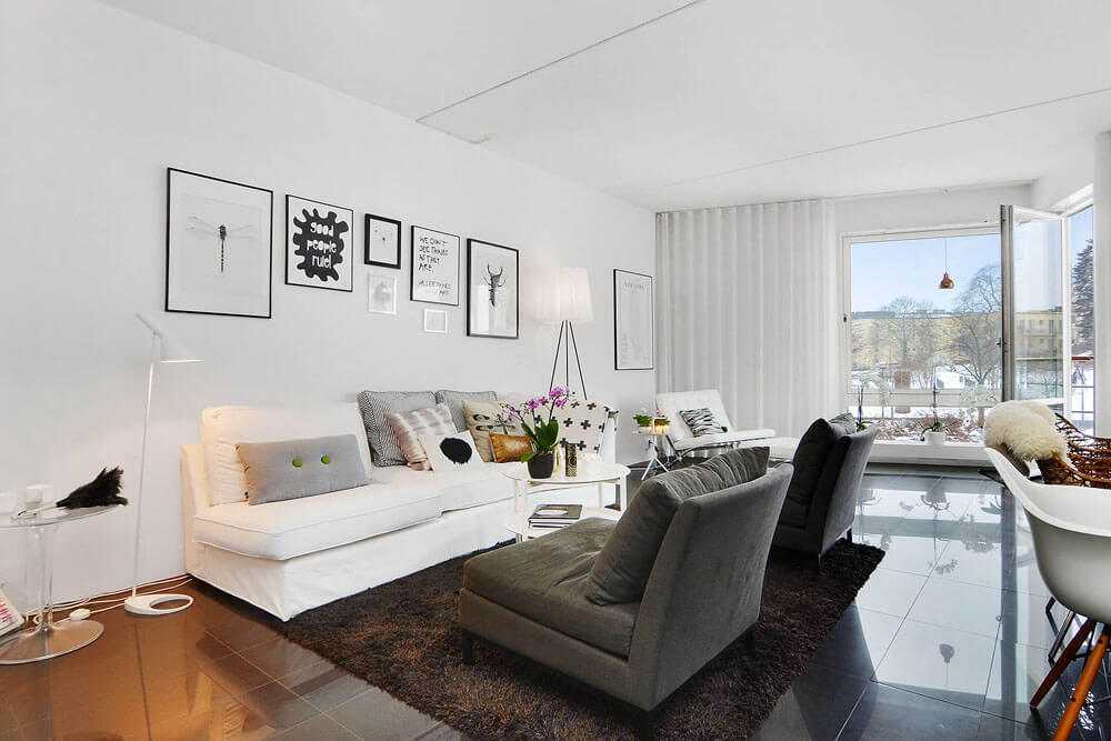 Еще один вариант гостиной в скандинавском стиле порадовал модным расположением стульев и наличием панорамного остекления.