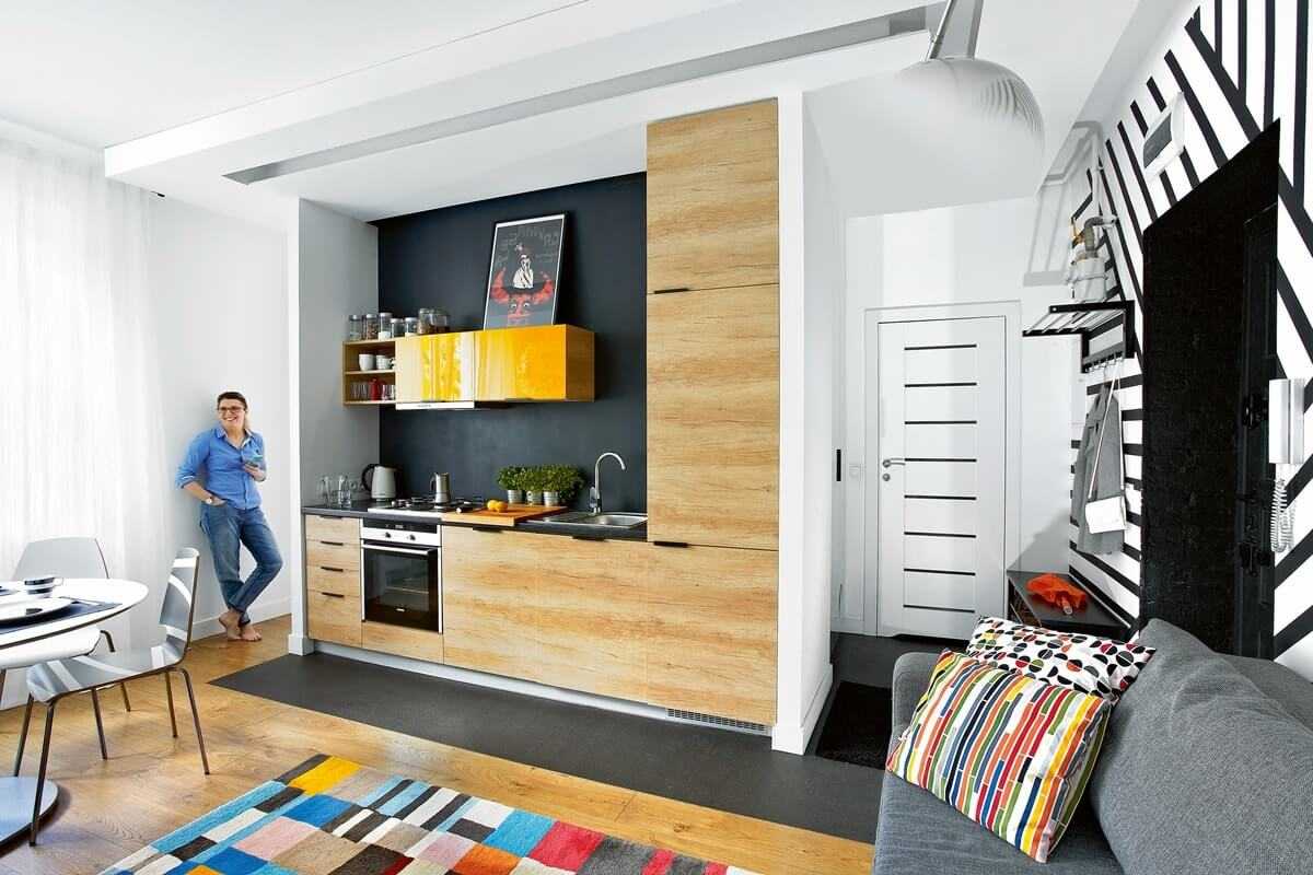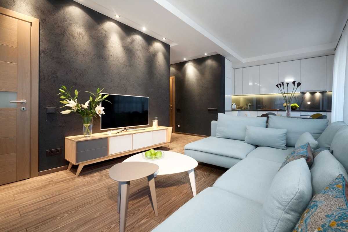 Отличный вариант для гостиной в современном стиле, на этот раз с кухней. Здесь коридор, кухня и гостиная — это одна комната, экономя место для одной или даже еще двух спален в двухкомнатной квартире!
