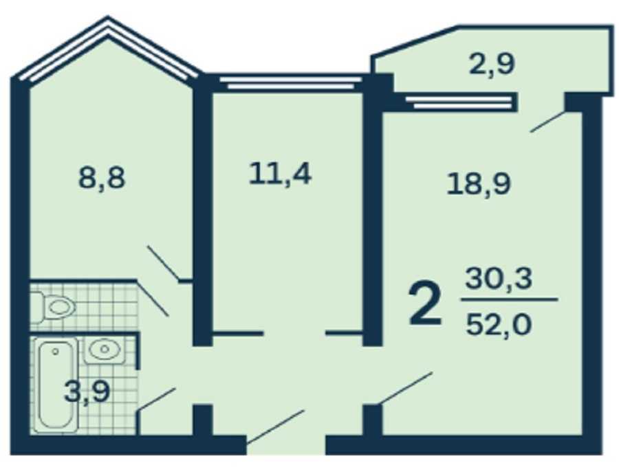 Все комнаты имеют прямоугольную форму, без излишеств, укладываясь в типовые размеры. Кухня, по сравнению с многокомнатными вариантами не превышает 8,5 м2, что достаточно мало для семьи.