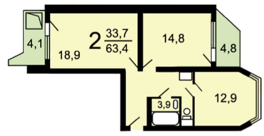 Другой вариант планировки — большая площадь всех помещений достигается за счет сложной формы квартиры. При этом площадь прихожей и ванной комнаты остались без изменений.