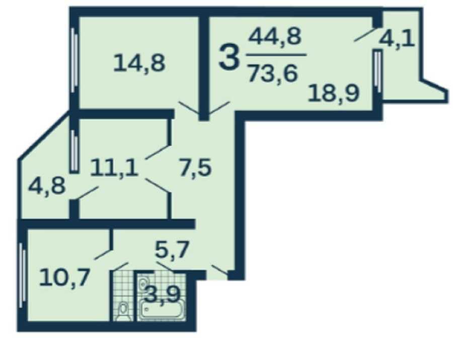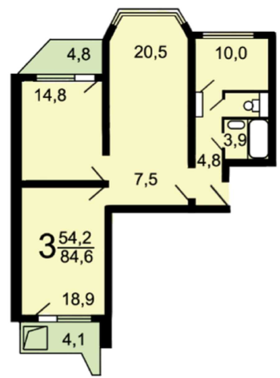 Следующий вариант планировки серии П44Т с размерами — трехкомнатная квартира, выполненная по проекту П-44Т, но имеющая существенно меньшую площадь. Крупная комната не превышает 19 м2, но оснащена собственной лоджией, как и наименьшая из комнат. Кухня чуть больше размером — 10,7 м2 против 10 м2 в предыдущем примере. Увеличена площадь коридора — 13,5 м2.