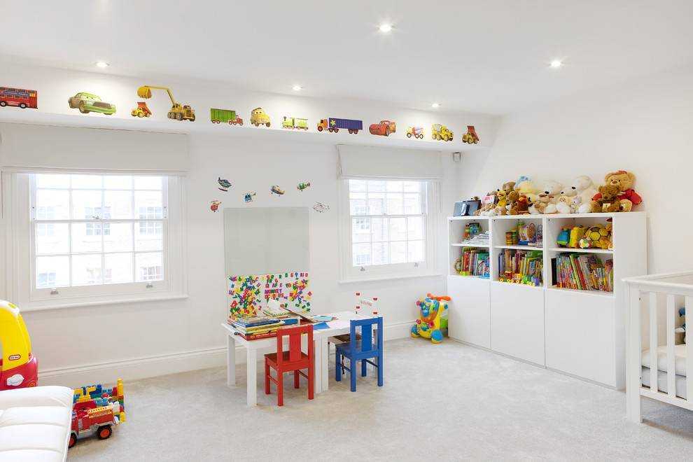 Для новорожденных будет достаточно кроваток, пеленального стола и манежа. Детям постарше нужна игровая зона: она может быть выполнена в качестве игрового комплекса, спортивной стенки или вместительного ящика с игрушками. Начиная со школьного возраста, появляется необходимость в зоне учебы: у каждого должен быть свой стол, чтобы дети могли выполнять домашние задания вместе.