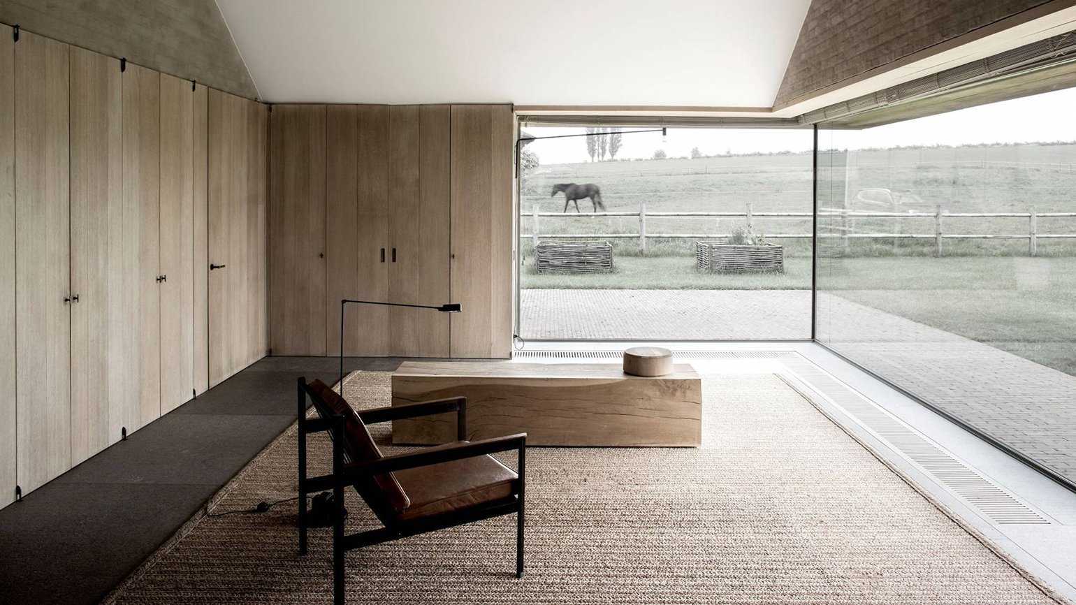 В главном доме он прорубил панорамные окна, из которых открывается вид на зеленеющие поля с лошадьми. Все поверхности внутри либо сделаны из дерева, либо выкрашены в природные цвета. За основу взяли оттенки белого, чёрного, коричневого и мятного.