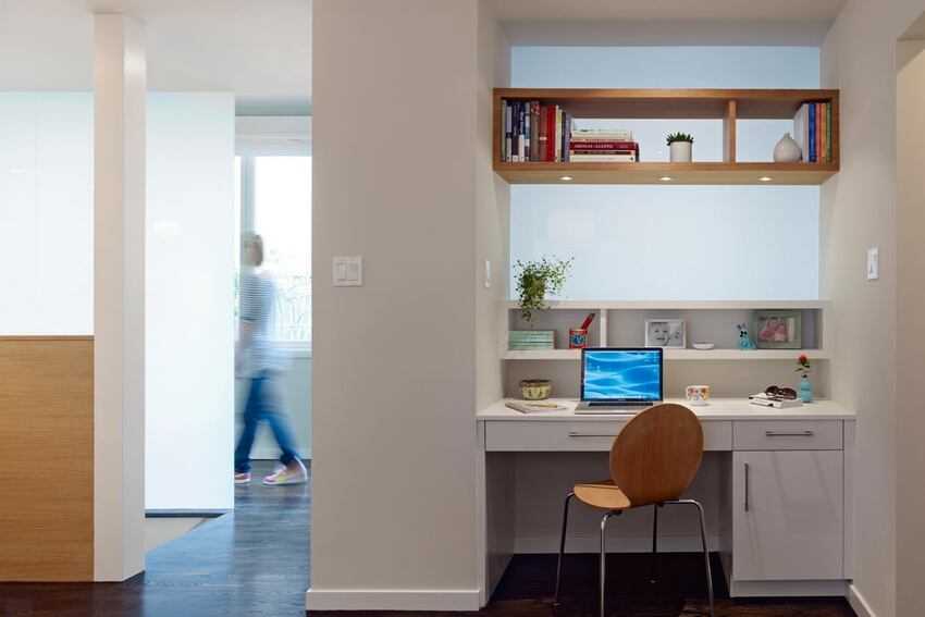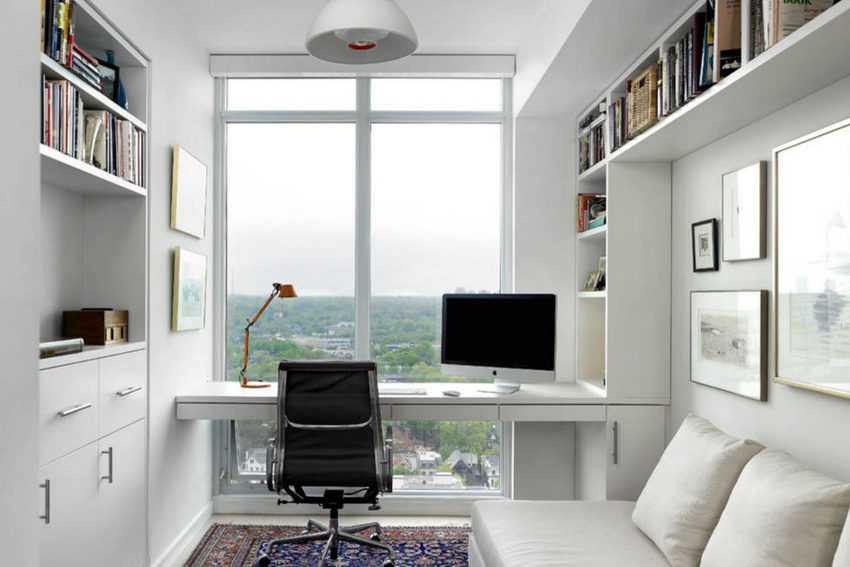 Наполнение рабочей зоны зависит от потребностей хозяина комнаты. Кому-то будет достаточно небольшого стола и кресла. А кому-то понадобятся дополнительные навесные полки, тумбы с ящиками и стеллажи для размещения техники, книг и документов.