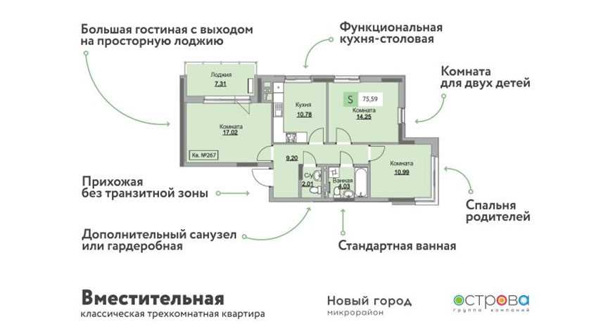 Разработана для семьи с двумя детьми. Образцовый пример правильного разделения в квартире частных (детской комнаты и спальни родителей) и общественных пространств (кухня, гостиная, лоджия).