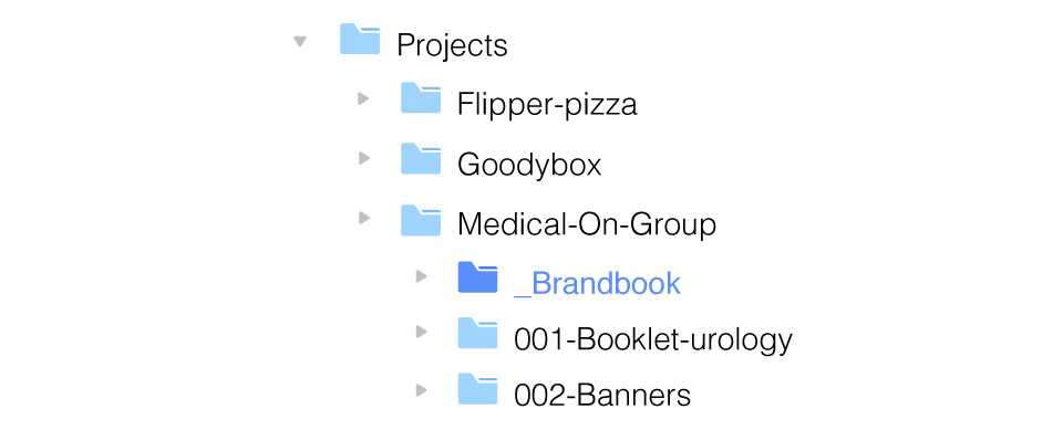 Иногда папка клиента включает в себя материалы, которые контролируют работу всего проекта. Ими может быть готовый брендбук, шаблоны полиграфии или необходимые шрифты. В этом случае заведите отдельную папку с названием, указывающим на содержимое: Brandbook, Templates, Fonts и так далее. Это помогает быстрее находить нужные исходники и не отходить от дизайн-концепции заказчика.