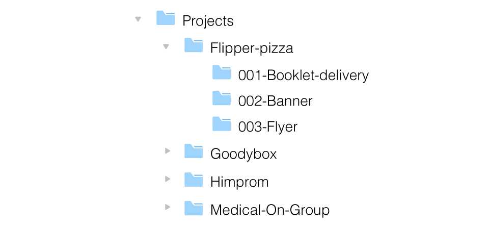 Внутри находятся папки для каждого клиентского проекта, будь то разработка логотипа, верстка брошюры, баннера или другого. Если клиент заказывает набор макетов в рамках одной рекламной компании, все они пойдут в общую папку.