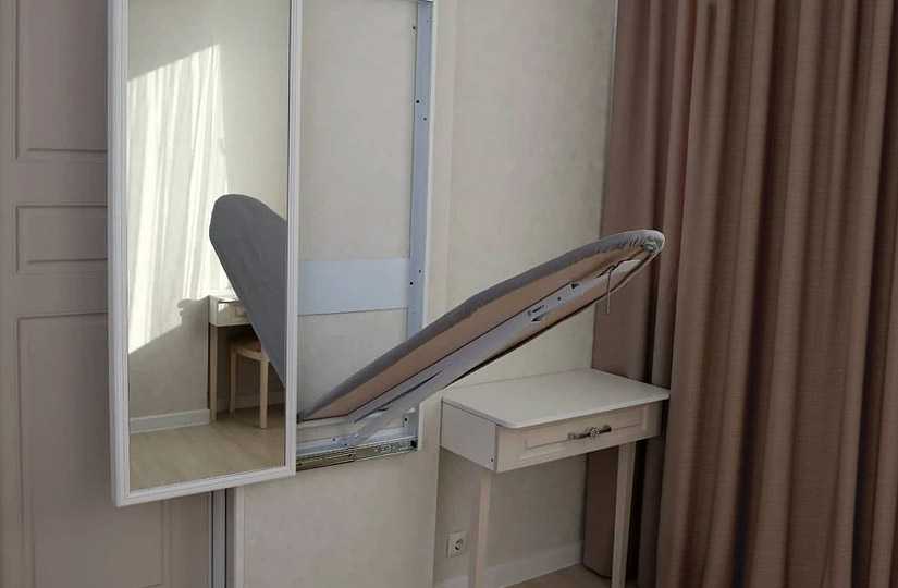 Для практичных хозяек подойдет интересное приспособление для глажки вещей, белья, которое встраивается в зеркало. Модели этого вида позволят не только сэкономить площадь в помещении, но и сделают пространство более функциональным. Гости, придя в квартиру, смогут увидеть большое зеркало, но за ним спрятано гладильное приспособление.