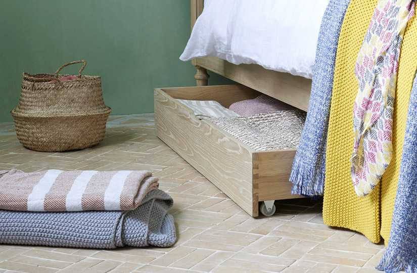 Кровать-подиум — отличный вариант для небольших квартир. Пространство под такими конструкциями и выдвижные ящики используют не только для постельного белья, но и для хранения крупногабаритных вещей. Положить доску под обычную кровать тоже можно, но там она не будет защищена от пыли, да и смотрится это неаккуратно. Единственный минус хранения в ящике подиума — придется наклоняться, чтобы достать доску. Так что способ не подойдет тем, у кого проблемы со спиной.
