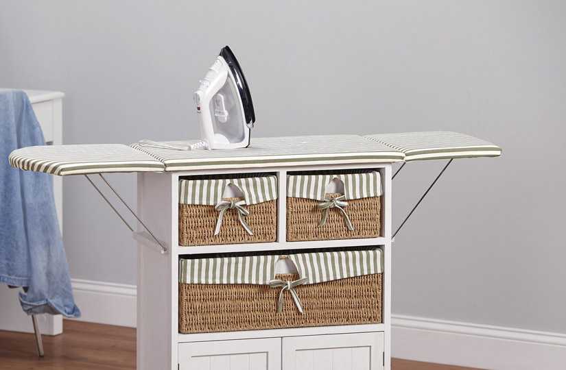 Необычное и очень функциональное решение — комод-трансформер со встроенной гладильной доской. Это полноценная гладильная станция, внутри которой можно хранить утюг и другие вещи. При желании комод легко передвинуть, чтобы гладить там, где вам удобно. Но все же такой вариант подходит не для любого дизайна квартиры: комоды-трансформеры чаще всего делают в стиле кантри, рустик, прованс или шебби-шик.