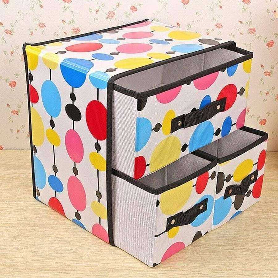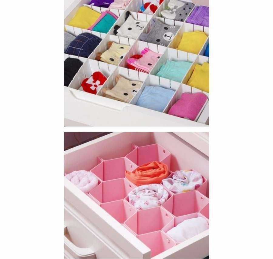 А вот идея для изготовления вместительного органайзера, который подходит для хранения детских носков, колготок и нижнего белья. Для перегородок (они могут быть прямоугольной формы или в виде «сот») подойдет картон.