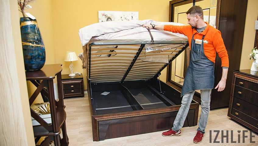 Разнообразие материалов, дизайнерских форм и оснащения позволяют выбрать модель, потребителям с различными материальными возможностями и подходящую к любому стилю интерьера. Без покупки не останется самый требовательный покупатель, оценив все преимущества и функциональность представляемых моделей.В кроватях с подъёмным механизмом обычно делают большие емкости, занимающие всю площадь. В некоторых моделях большой ящик разбивают на отделения, используя перекладины и перегородки. Чтобы облегчить прилагаемые усилия, подъёмники оснащают амортизаторами или пружинами.На видео представлен принцип работы подъёмного механизма при открывании ящика кровати: