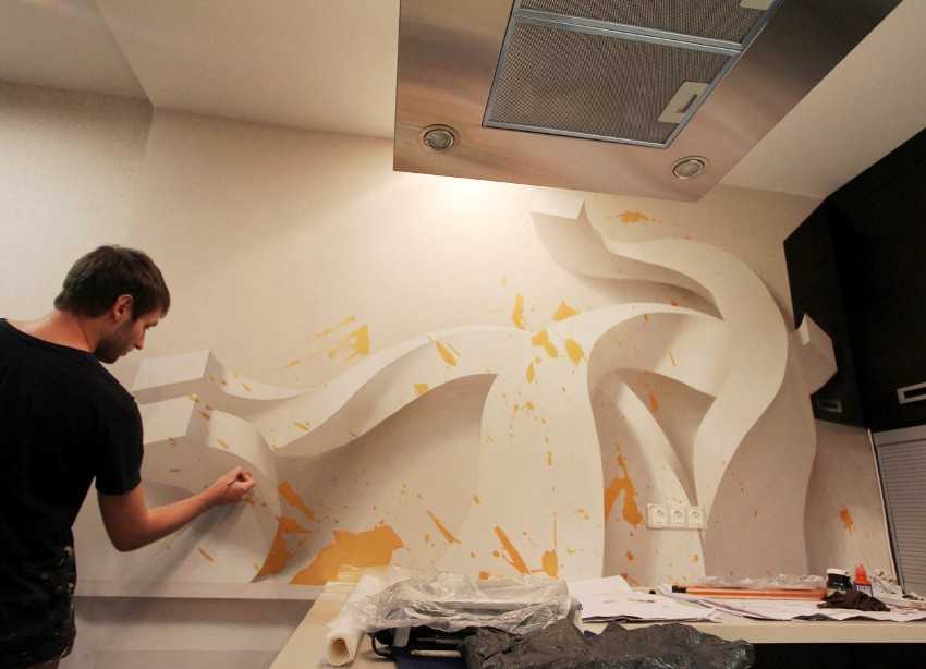 Процесс нанесения 3D-рисунка на стену в кухне