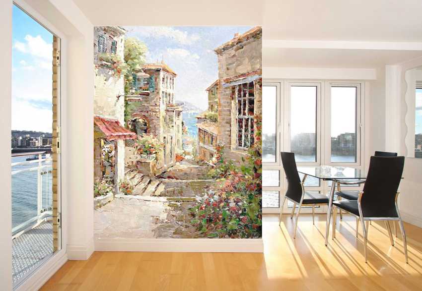 Применение росписи стен в интерьере прихожей сделает это скучное пространство гораздо интереснее. Выберите только одну самую заметную сторону и разместите на ней абстрактное полотно или вид города с улочками.