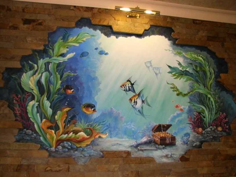 3D-роспись – иногда этот вид рисунков называют обманкой. С ее помощью можно значительно расширить пространство, придать помещению нестандартный вид. Данный тип росписи является самым сложным, поэтому выполнить его может только профессиональный художник.