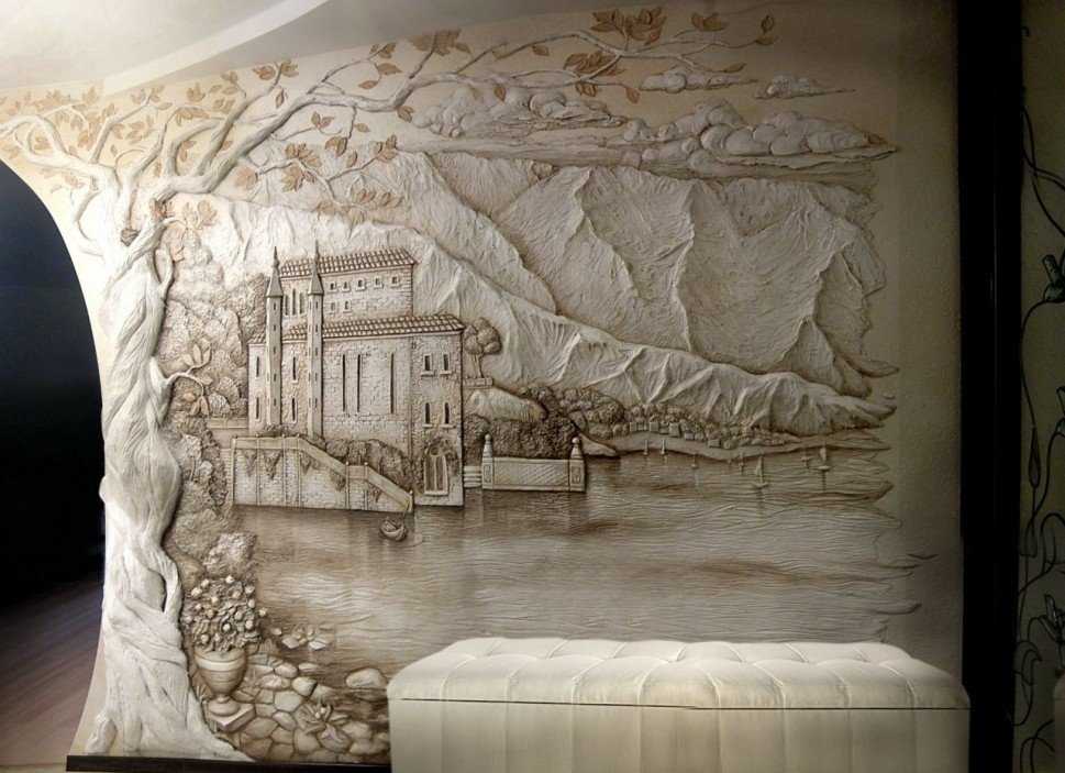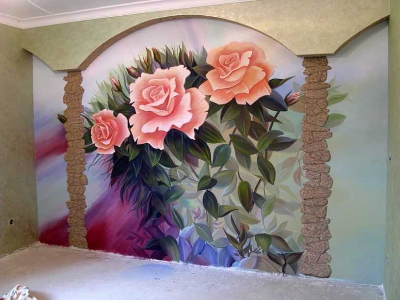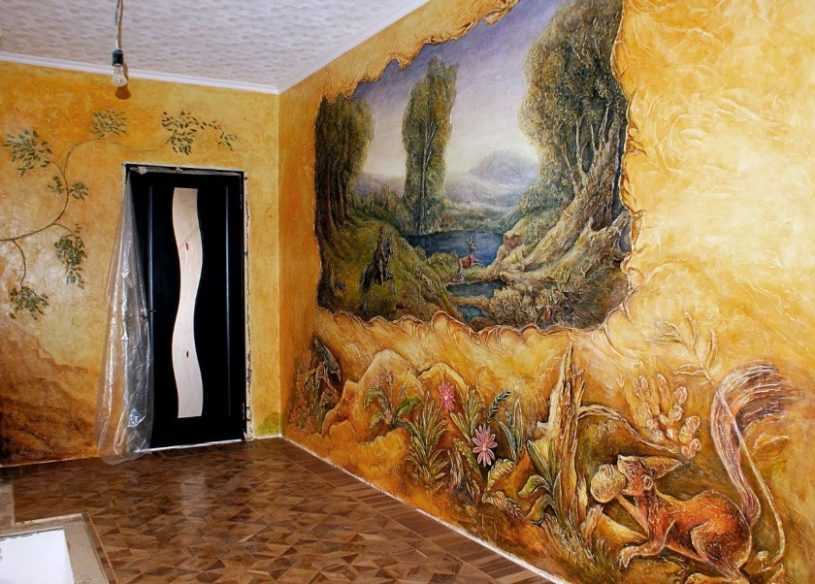 Не менее красивые варианты росписи стен получаются при использовании декоративной штукатурки. Благодаря ей рисунок получает дополнительный объем и выразительность.