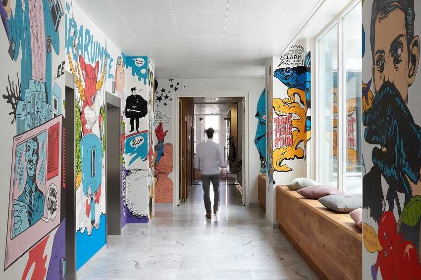 Интерьер современной квартиры дополнен нарисованными на стенах комиксами