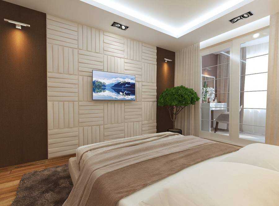 Цвета отделки — древесные, спокойные, очень хороший вариант для гостиной, в которой собираются, чтобы расслабиться и отдохнуть. Разнообразие привносит текстура отделки — оригинальные настенные панели.