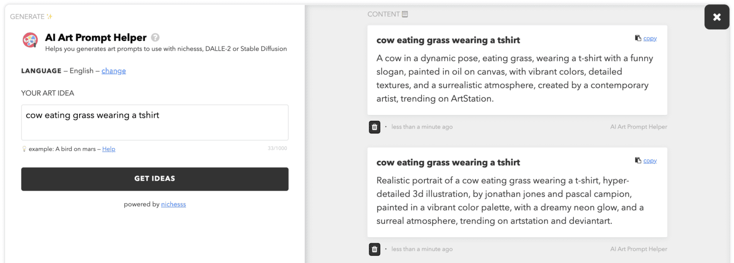 Это один из моих фаворитов в этом списке из-за того, что он генерирует подсказки самого высокого качества, которые вы когда-либо найдете. AI Art Prompt Generator от Xquissive может помочь вам придумать множество отличных идей для контента, независимо от ниши.