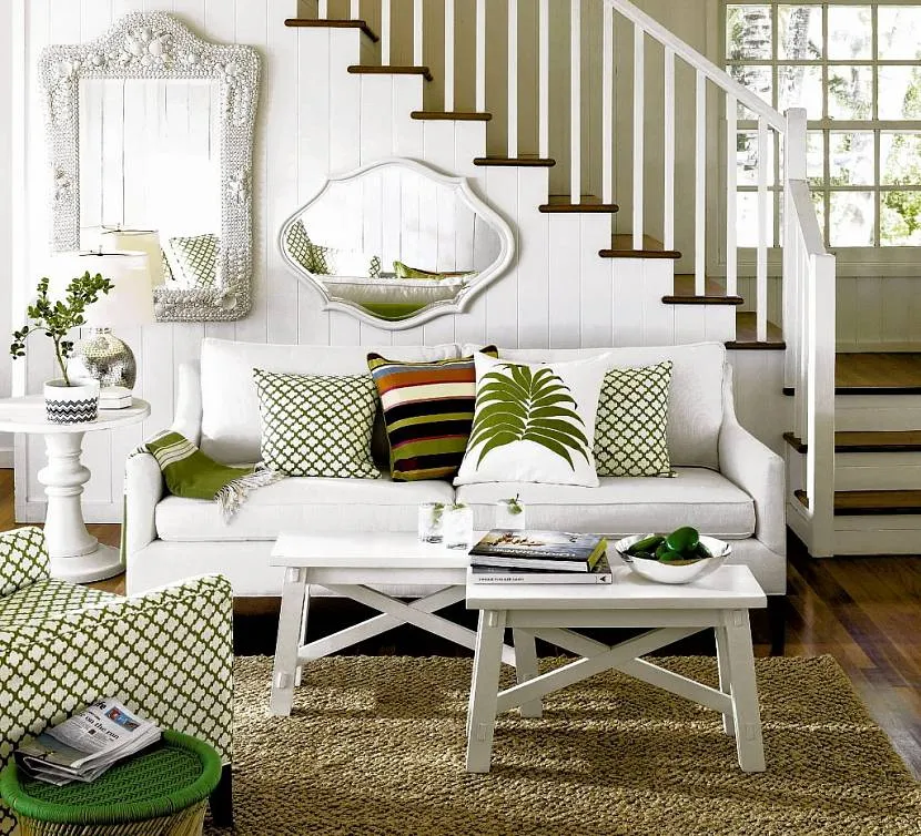 Ключевые элементы. В таком интерьере преобладают светлые тона ― белый, серый, голубой, беж ― в сочетании с оттенками дерева. Может использоваться яркий текстиль — например, пледы с цветным орнаментом, салфетки, полотенца. Мебель простых форм ― мягкая или из дерева.