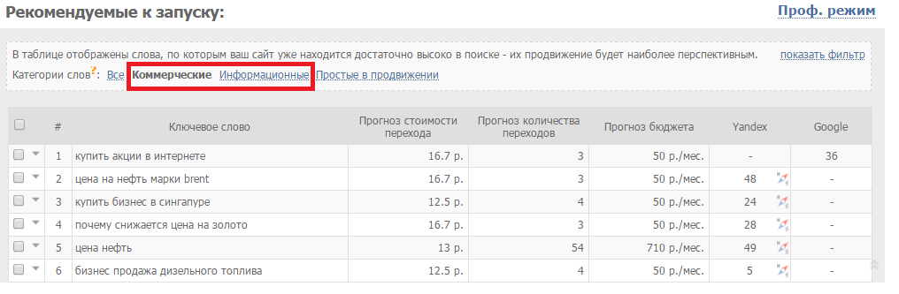 SeoPult подскажет, по каким фразам сайты конкурентов продвигаются в рекламных сетях. Семантическое ядро автоматически актуализируется — не придется обновлять поисковые запросы самостоятельно. Приложение подскажет, какие запросы из вашего ядра коммерческие, а какие информационные — это нужно учитывать при продвижении.