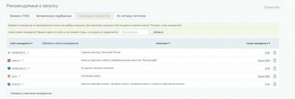 SeoPult подсказывает, какие сайты являются конкурентами по ключевым словами