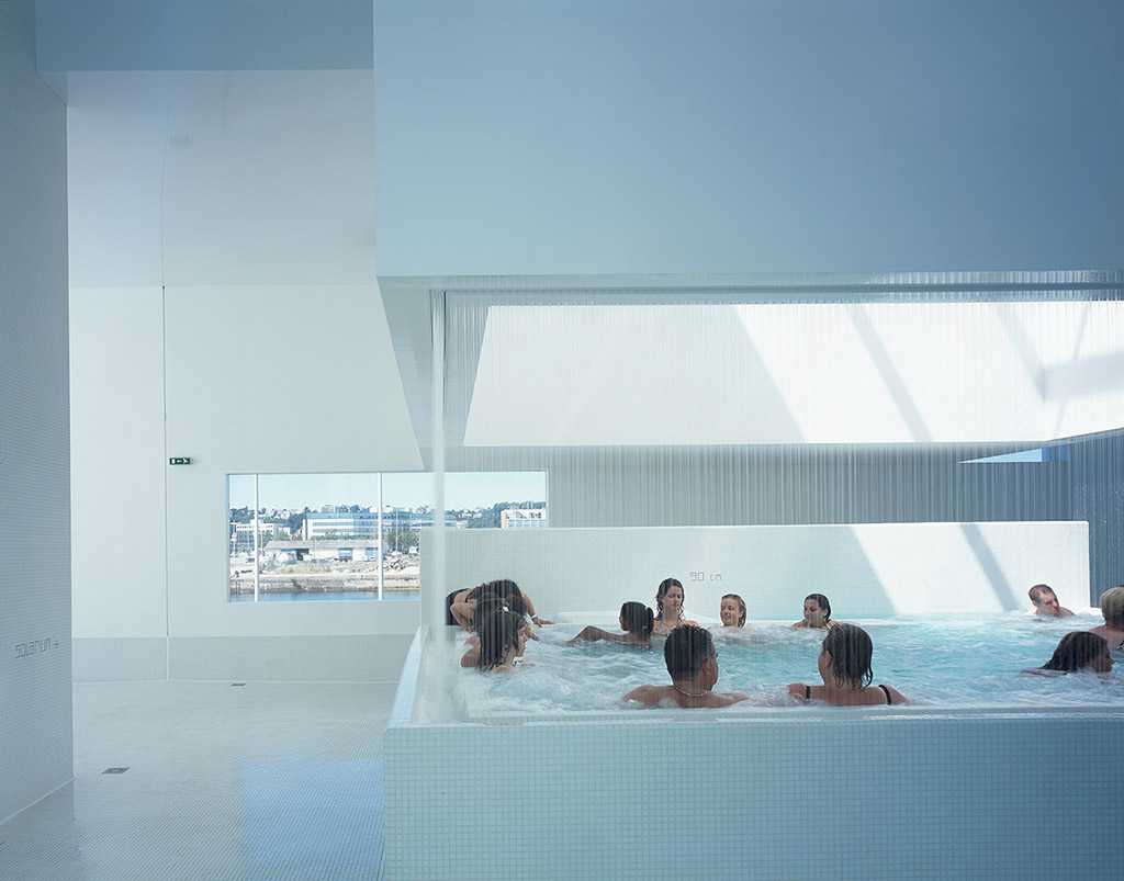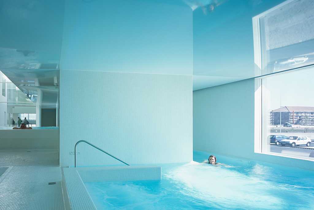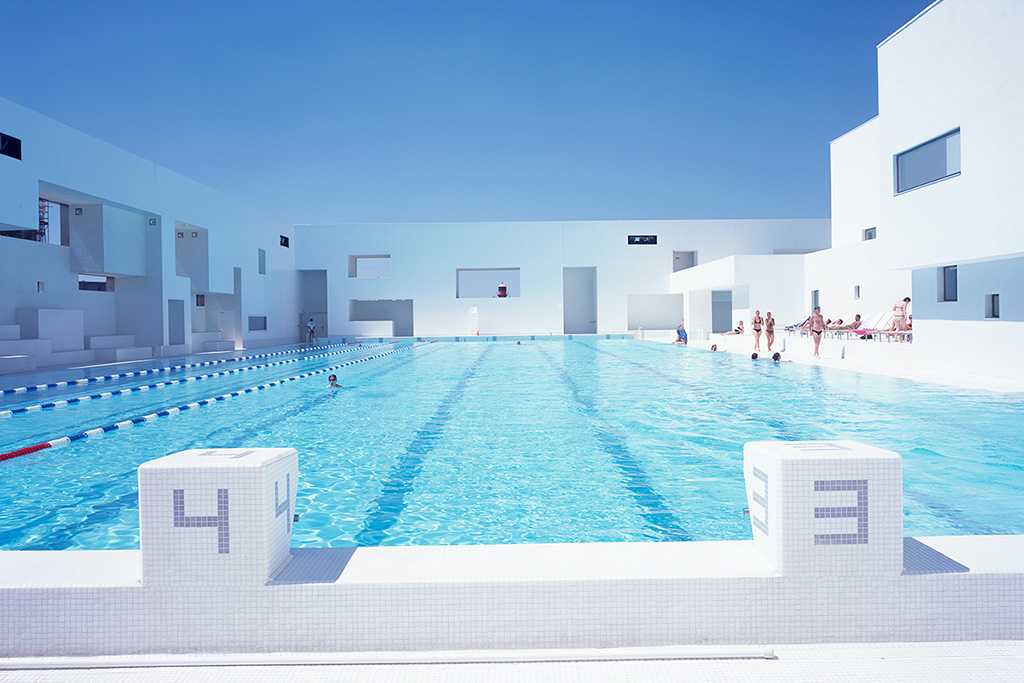 Постройка в Гавре, портовом городе на севере Франции, объединяет подогреваемый олимпийский 50-метровый бассейн под открытым небом, частично открытую, а частично расположенную под крышей зону отдыха у воды, «лягушатник», SPA-центр, а также два подвесных бассейна и кафетерий с террасой на втором уровне. Зоны связаны переходами, и посетители могут легко перемещаться между ними. Вместо привычного единого объема Нувель создал систему пространств со сложной, хоть и жесткой геометрией, где каждый найдет комфортное именно для себя место. Белый цвет поверхностей подчеркивает строгость форм, он разбавлен лишь яркими акцентами детской игровой зоны.