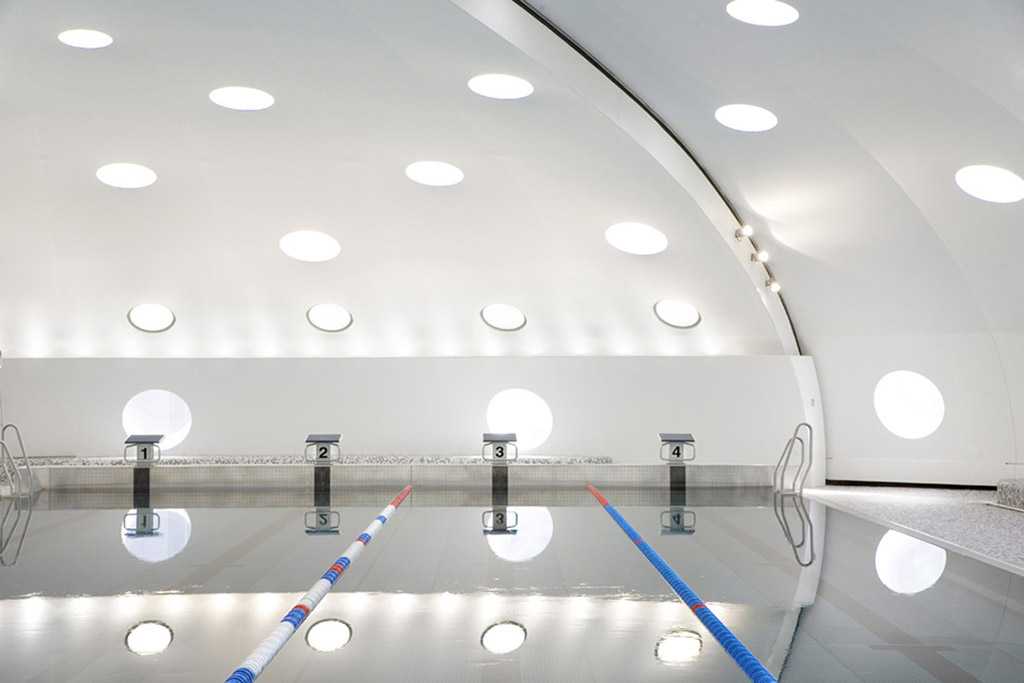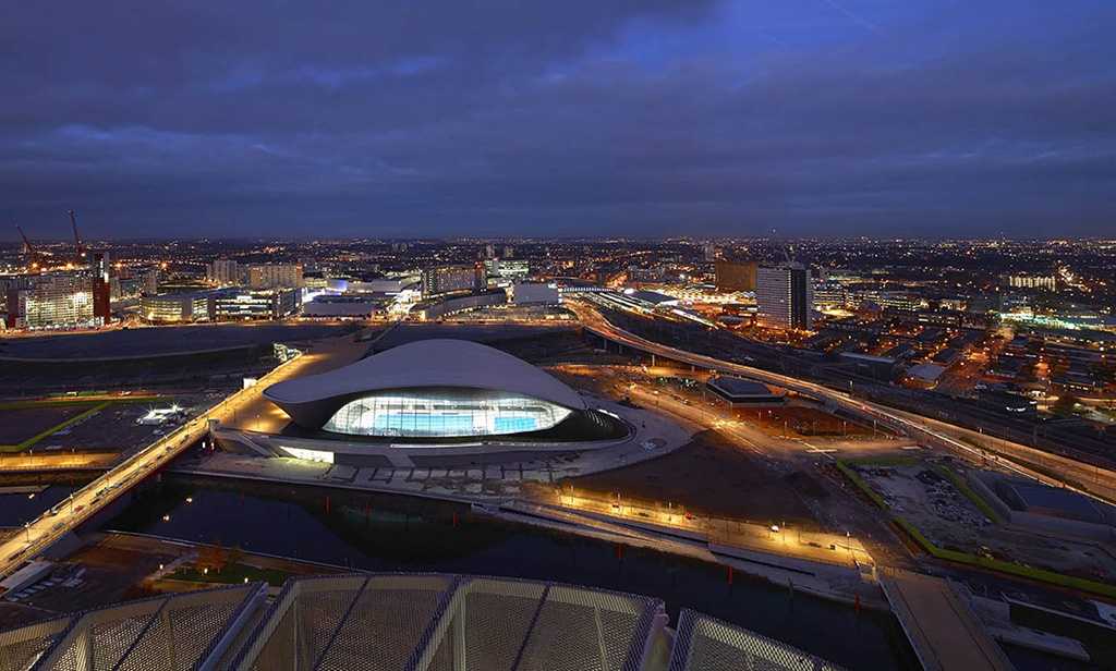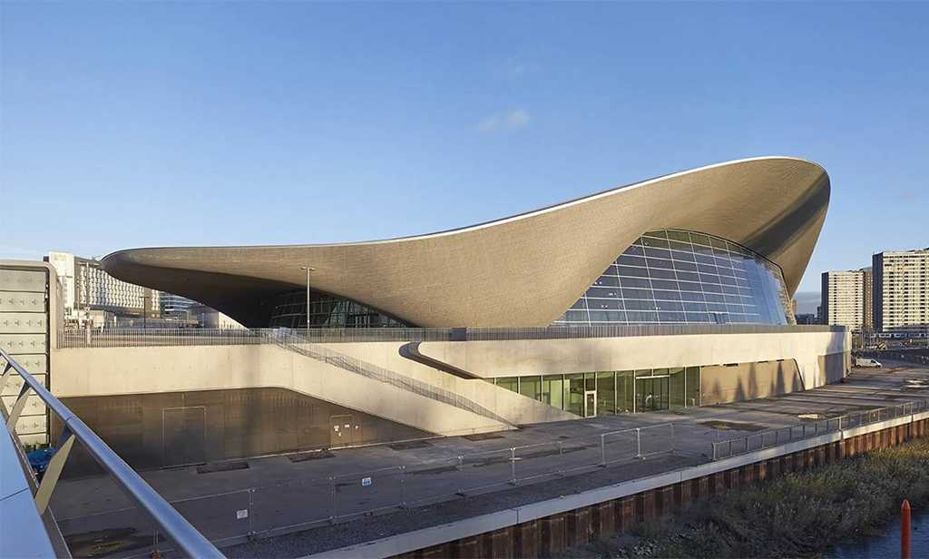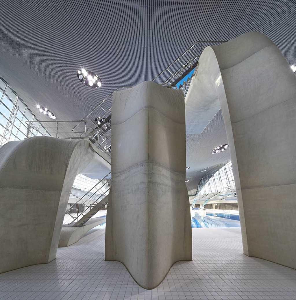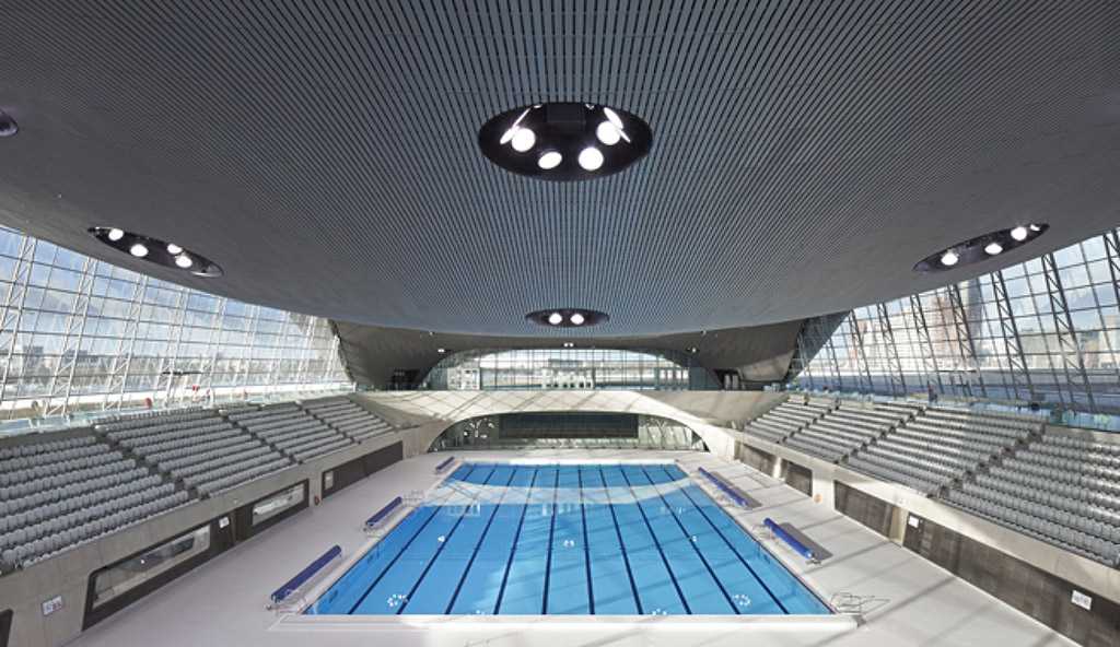 Центр водных видов спорта строился к лондонской Олимпиаде 2012 года. Без угловатых дополнительных трибун, которые были необходимы только на время игр, он наконец обрел задуманную ромбовидную форму и демонстрирует фирменную бионику Хадид. Открывшееся сплошное остекление боковых «фасадов» (если это слово вообще будет тут уместно) создает светлое, дышащее внутреннее пространство. Практически безопорная конструкция крыши отделана изнутри теплым деревом, она не только буквально визуализирует мотив волны и смягчает открытые бетонные поверхности, но и помогает зонировать единый протяженный объем.