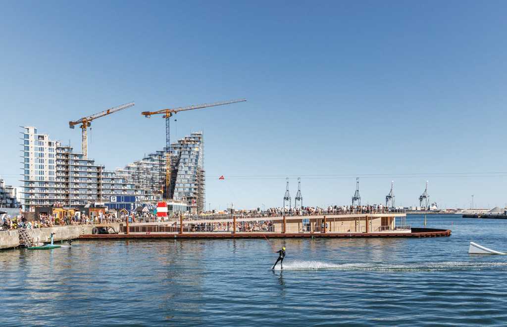 Тридцатого июня во втором по величине городе Дании открылась крупнейшая в мире городская купальня. Архитекторы бюро Бьярке Ингельса не первый раз работают с таким довольно специфическим типом сооружений. Созданная ими плавающая конструкция объединяет 50-метровый бассейн, лягушатник, прыжковый бассейн и две сауны и может одновременно вместить до 650 человек. В дополнение к пирсу вдоль набережной организован променад с кафе и спортивными площадками. Концепцию планируется развивать и дальше, формируя вокруг полноценную торгово-развлекательную зону.