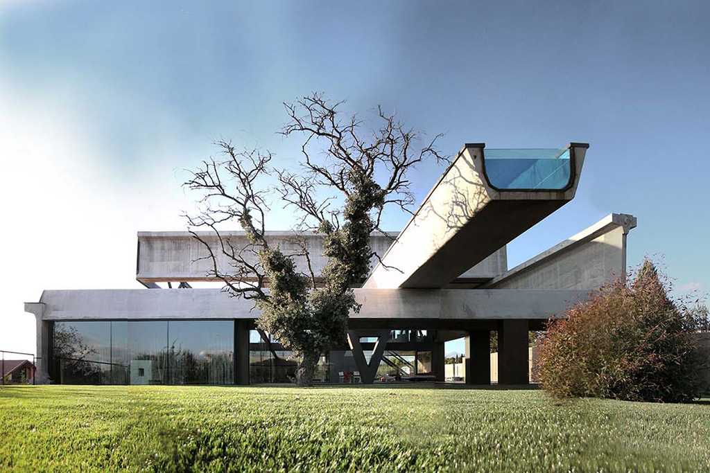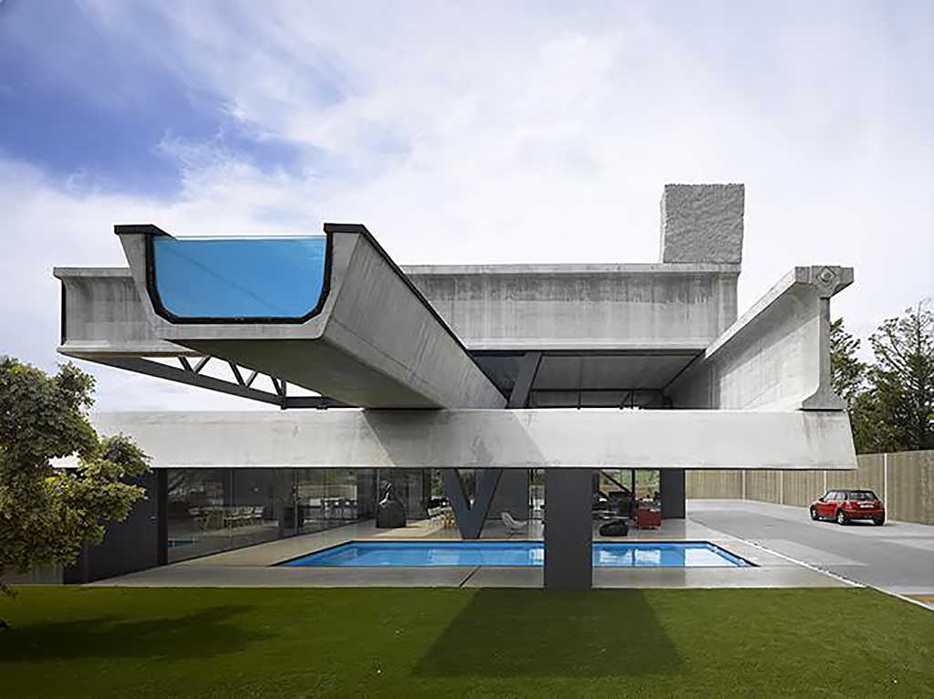 По словам архитекторов, название проекта они позаимствовали у древних греков, обозначавших словом «hemeroscopium» место захода солнца — что-то вполне реальное, видимое и одновременно абсолютно недостижимое, зыбкое. Дом был собран всего за 7 дней и всего из 7 готовых элементов, а вот на разработку и точную «подгонку» конструктивных решений понадобился целый год. Бассейнов в доме два: один привычно расположен на уровне земли, а вторым стал узкий и длинный элемент консольной конструкции, уравновешенный 20-тонным гранитным камнем.