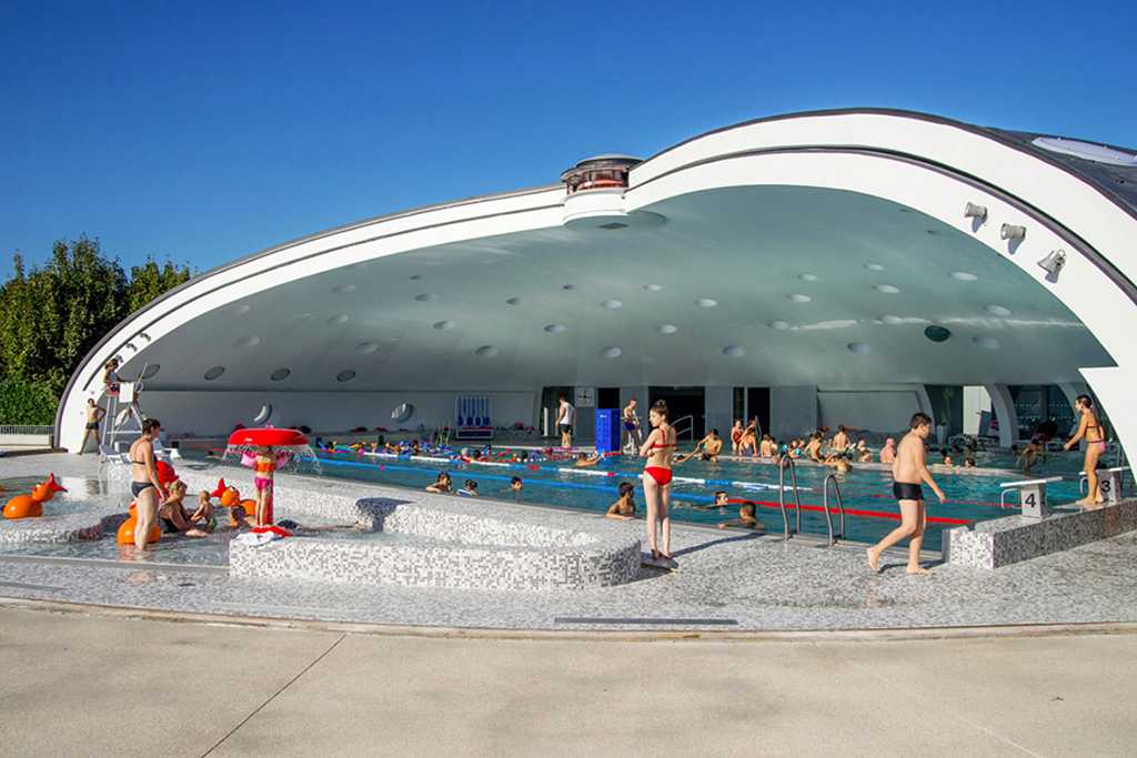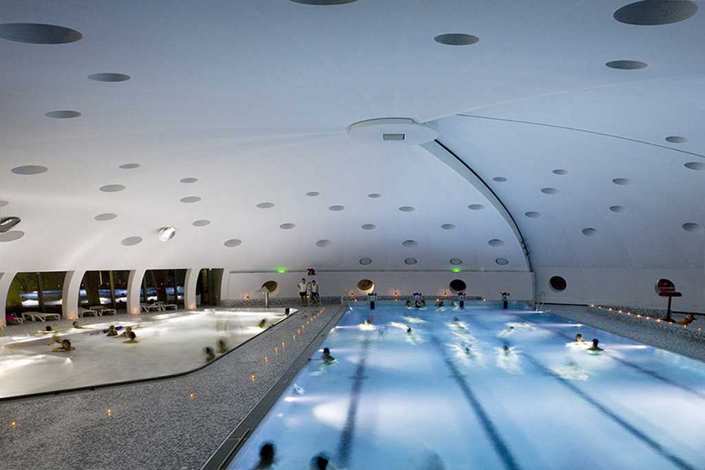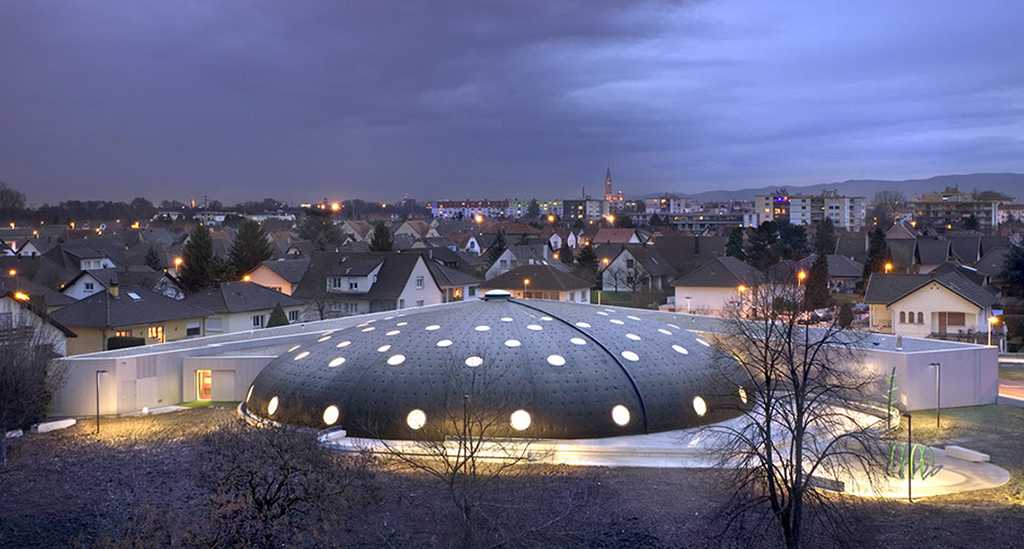 Бассейны, название которых переводится как «подсолнух», в 1970-х годах строились по всей Франции, автор типового проекта — Бернар Шёллер. Один из них, расположенный недалеко от Страсбурга, был реконструирован в 2014-м. Местные архитекторы очистили от позднейших пристроек купол с раздвижными створками, буквально навязывающий ассоциации с фантастической летающей тарелкой. Внутри к первоначальному 25-метровому бассейну добавили еще два с ваннами из нержавейки, а чтобы освободить цельное безопорное пространство, раздевалки, душевые, офисы и все технические помещения вынесли в отдельный объем, как бы «обнимающий» заднюю часть купола.