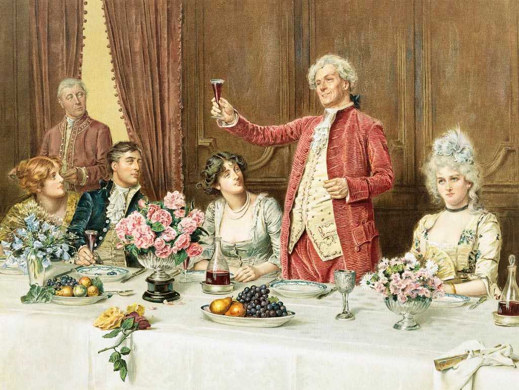 Чтобы избежать убийств, при дворах королей была введена традиция чокаться бокалами перед началом пира. Но прежде сам хозяин выпивал из большого кубка. И только затем вино разливали по бокалам гостей. А затем они так сильно чокались бокалами, что вино выплёскивалось и попадало в другие бокалы. Если в каком-то был яд, то под угрозой оказывались все. И чем сильнее бокал одного человека стукался о другой бокал, тем сильнее было доверие между этими людьми. Иногда могли предложить обменяться бокалами. Те, кто ничего дурного не замышлял, охотно соглашались сделать это. А вот отравители отказывались, на чём и прогорали. Долгое время традиция чокаться была лишь у знати.